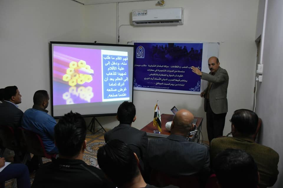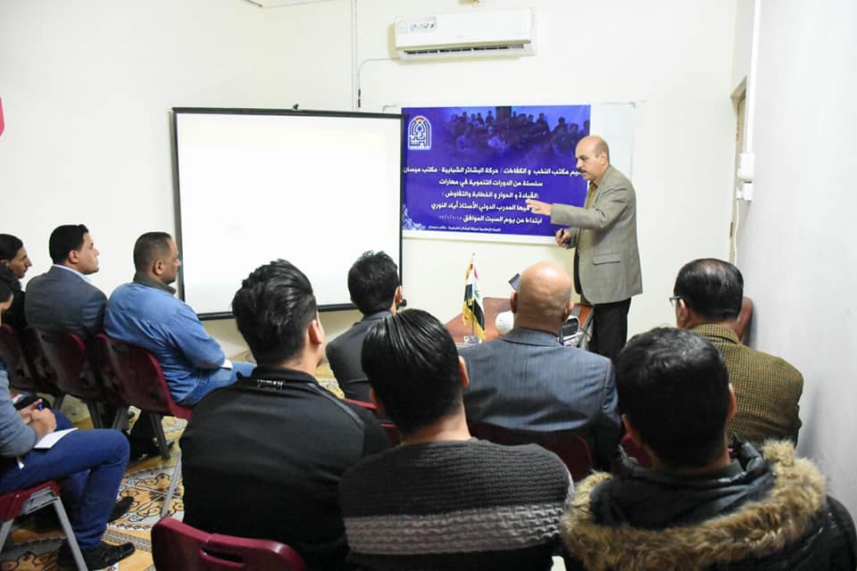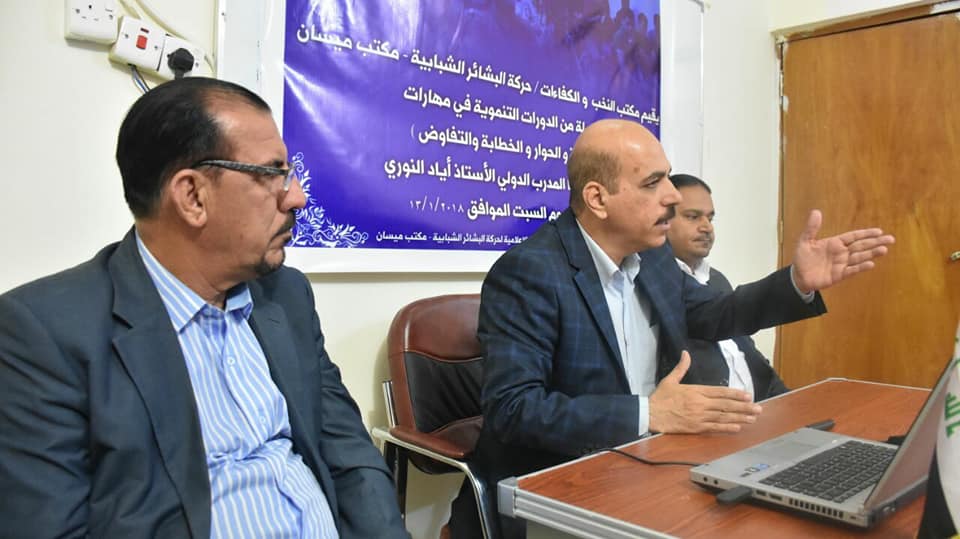 مكتب النخب والكفاءات لحركة البشائر الشبابية مكتب ميسان يقيم سلسلة من الدورات التنموية في مهارات ( القيادة والحوار والخطابة والتفاوض ) يحا ضر فيها المدرب الدولي الأستاذ أياد النوري