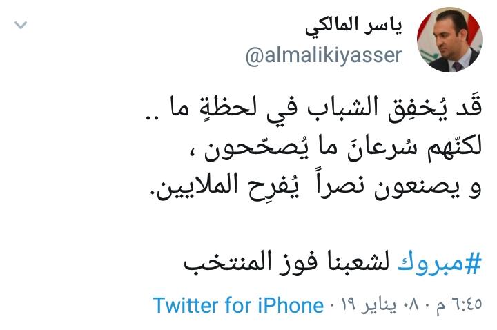 الامين العام لحركة البشائر الشبابية النائب ياسر المالكي في تغريدة على تويتر : شبابنا صنعوا نصرا أفرح الملايين